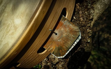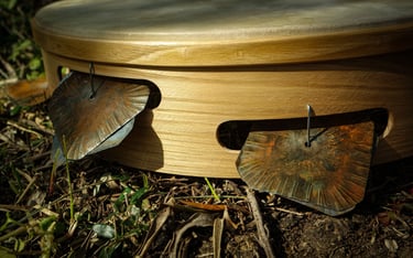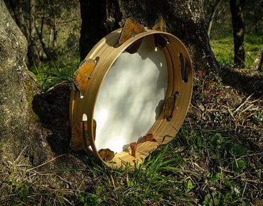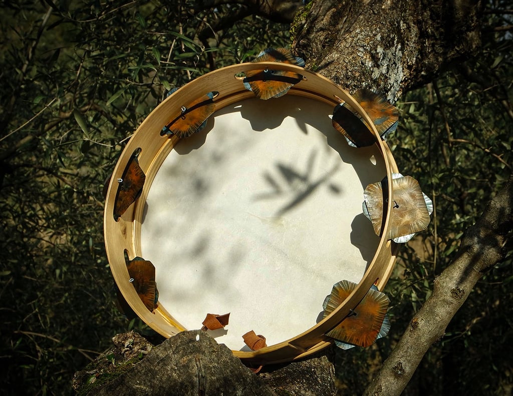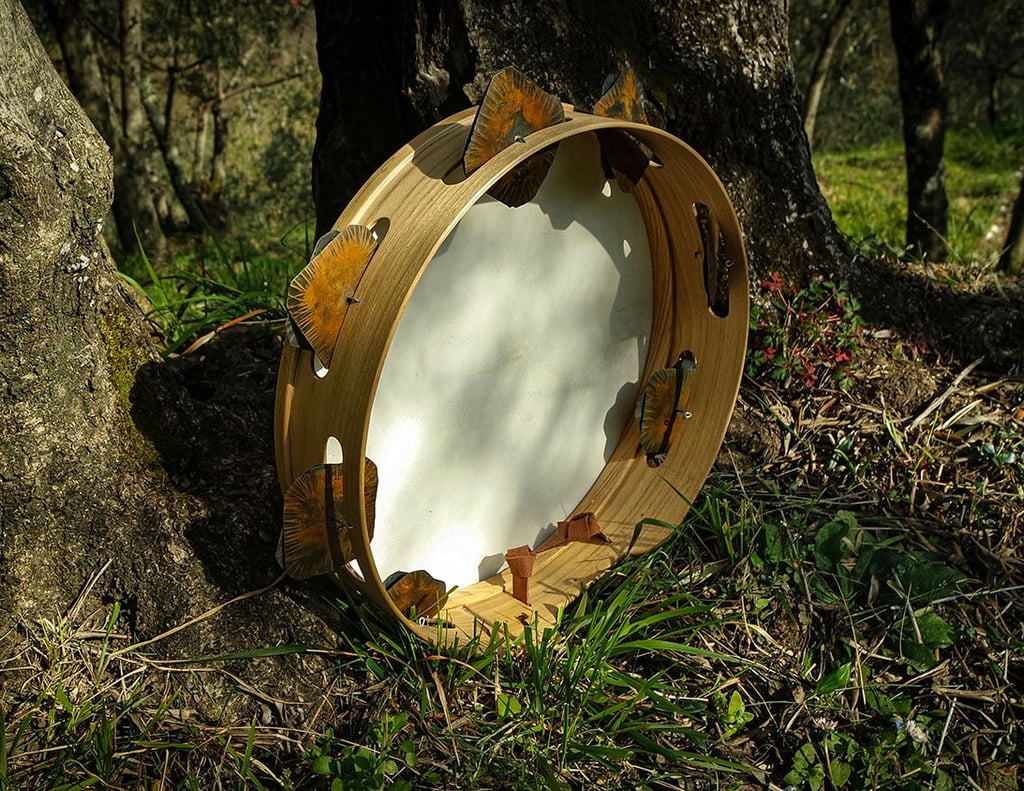 Il tamburo descritto rappresenta un'evoluzione affascinante del "primitivo", con un'accurata lavorazione e rifiniture che ne esaltano la bellezza e la durata. La sua superficie è colorata e laccata, offrendo una protezione superiore nel tempo. I sonagli, forgiati a mano e con una patina di ruggine, aggiungono un tocco di autenticità e carattere. Questo strumento è disponibile in diverse dimensioni, da 10 a 16 pollici, e può essere realizzato in vari stili tradizionali, come il laziale, il salentino, il vesuviano, il calabrese e il siciliano. La combinazione di una manifattura eccellente e un patrimonio culturale ricco rende questo tamburo non solo uno strumento musicale, ma anche un simbolo di tradizione e arte artigianale.